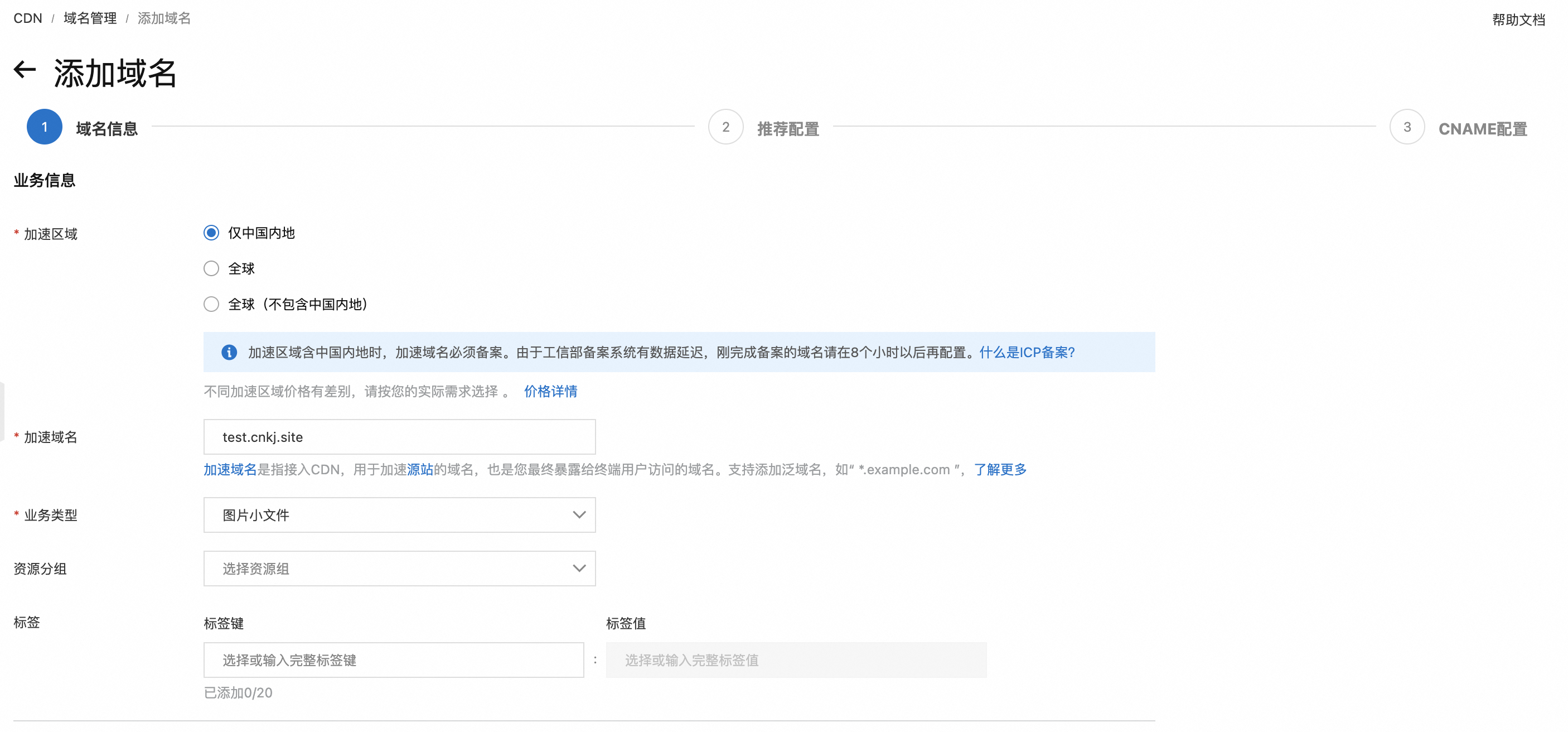 另外需要注意的是,阿里云CDN进行加速的域名需要实名和备案,如果没有实名和备案的域名是无法进行使用、添加的
